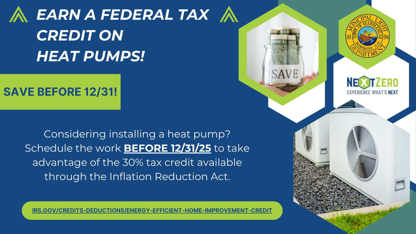 NEXT ZERO is Marblehead’s Residential Energy Efficiency and Conservation service. NEXTZERO provides Home Energy Audits (HEA), assistance with Home Energy Improvements, EV Charger Programs, ENERGY STAR® Appliance Rebates, Heating & Cooling Rebates, and much more. Click through the options below to see some of latest program graphics or visit NEXTZERO Marblehead.